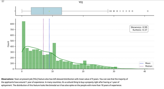 The Years on Job (YOJ) feature was left-skewed, with a large proportion of applicants having only 1 year of job experience, which was informative for predicting stability.